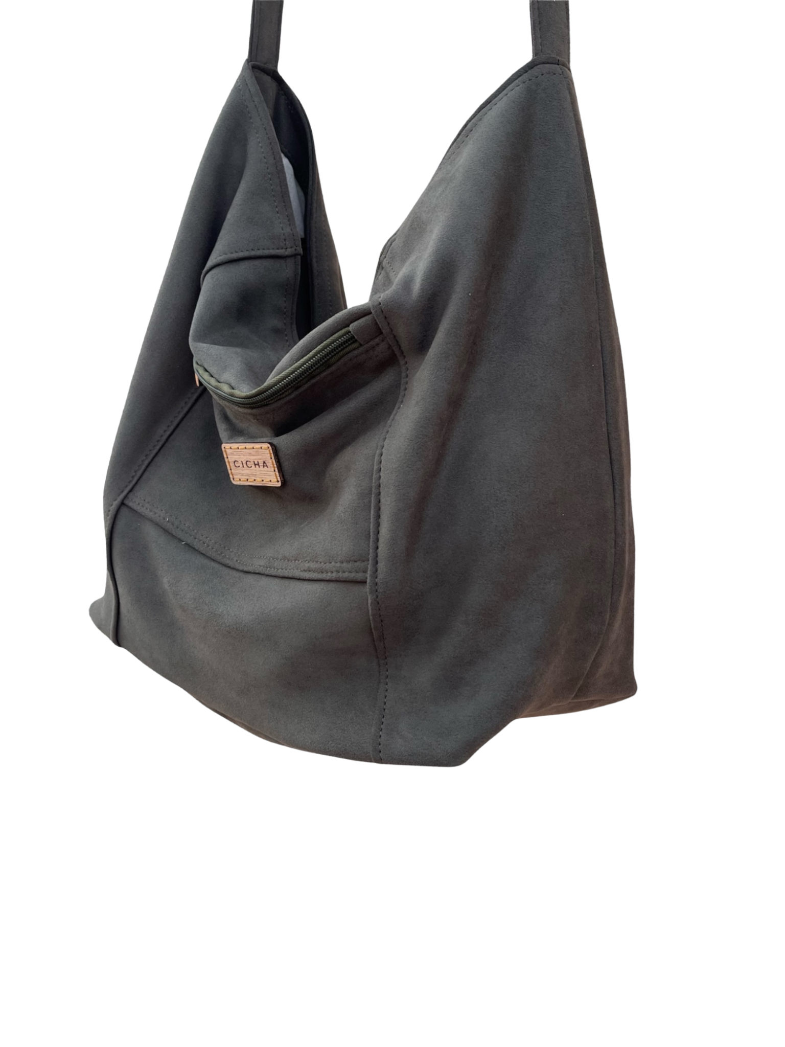 Bolsa artesanal, realizada en eco gamuza y manta de algodón.